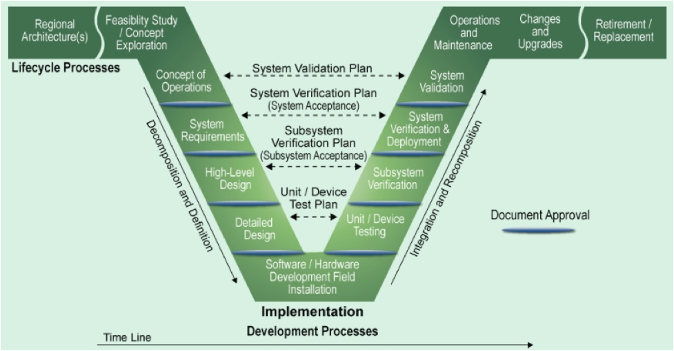 Let’s look at the V model again. This version comes from the Federal Highway Administration, and it has an extra step on each side of the V, as well as wings at the top. Seriously, they call them wings.